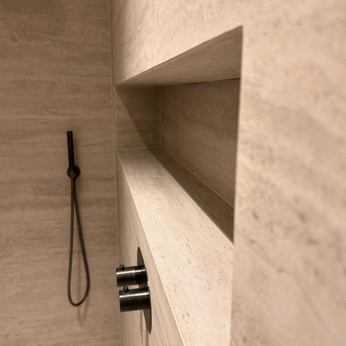 Een handige inbouwnis om al jouw badkamer benodigdheden in op te bergen, hier zijn de hoeken in verstek afgewerkt.